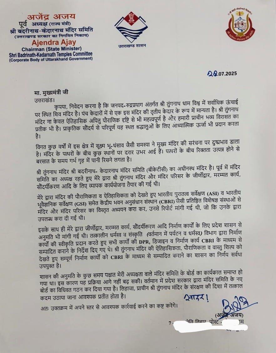 अजेंद्र ने कहा कि तुंगनाथ मंदिर बीकेटीसी के अधीन है। मंदिर समिति का अध्यक्ष रहते हुए उनके द्वारा तुंगनाथ मंदिर और मंदिर परिसर के जीर्णोद्वार, मरम्मत कार्य, सौंदर्यीकरण आदि के लिए व्यापक कार्ययोजना तैयार की गई थी।